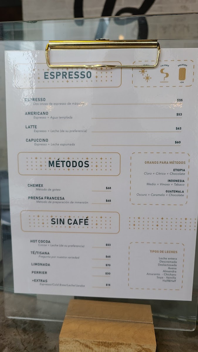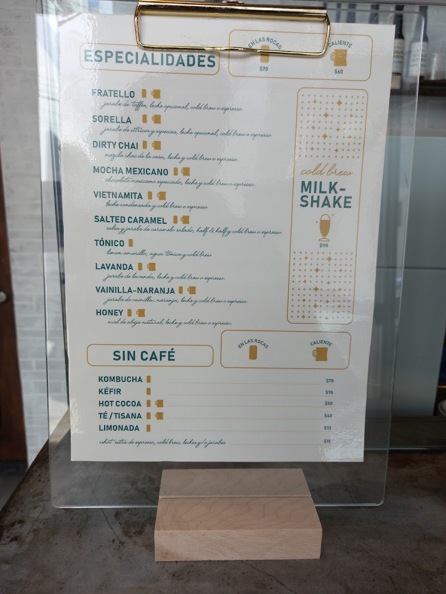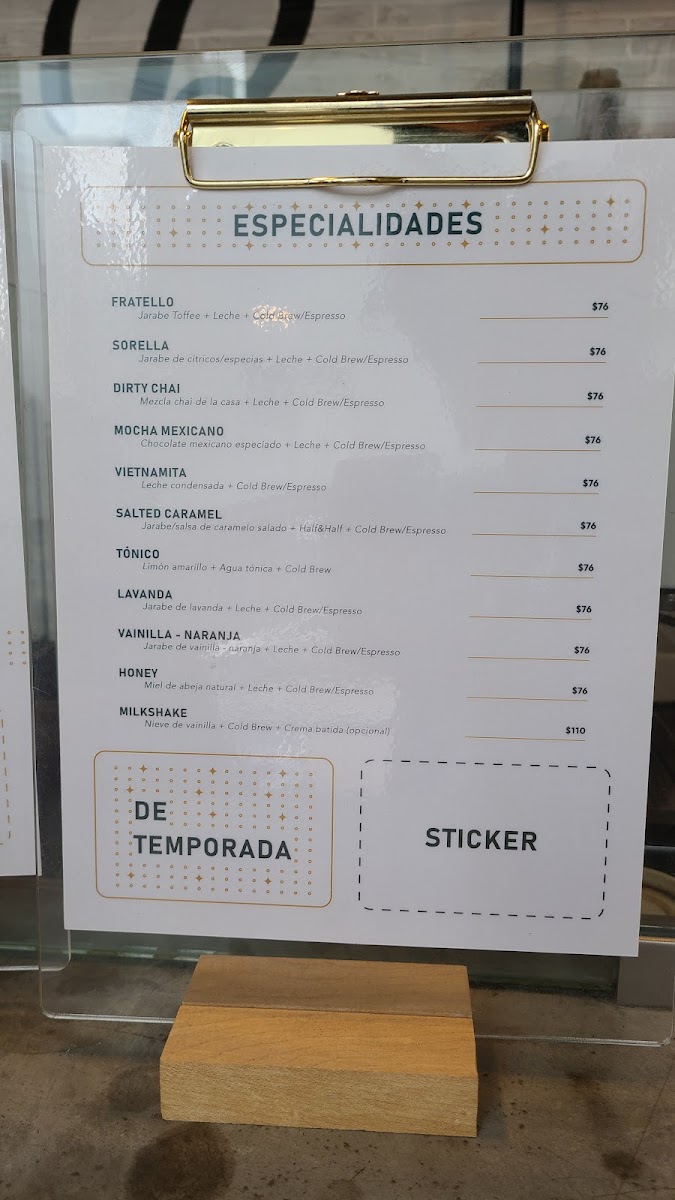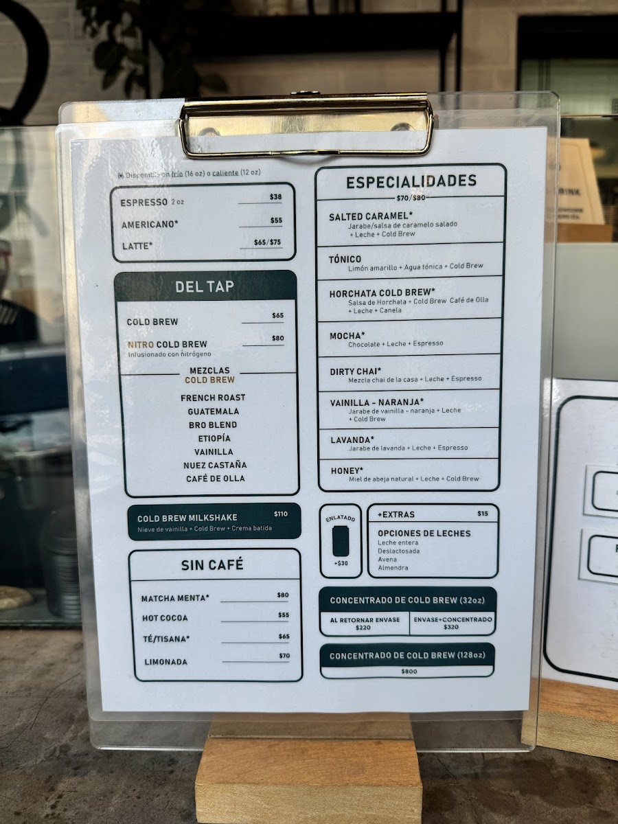 The Especialidades section brings exciting innovations, such as the creamy Horchata Cold Brew Latte and the refreshing Tónico, a drink perfect for those who want something crisp and light. For a fragrant and refreshing twist, the Latte Lavanda Frío and Latte De Vainilla-Naranja combine the floral notes of lavender and the zest of vanilla-orange, while the Dirty Chai Frio is an indulgent, spiced cold treat.